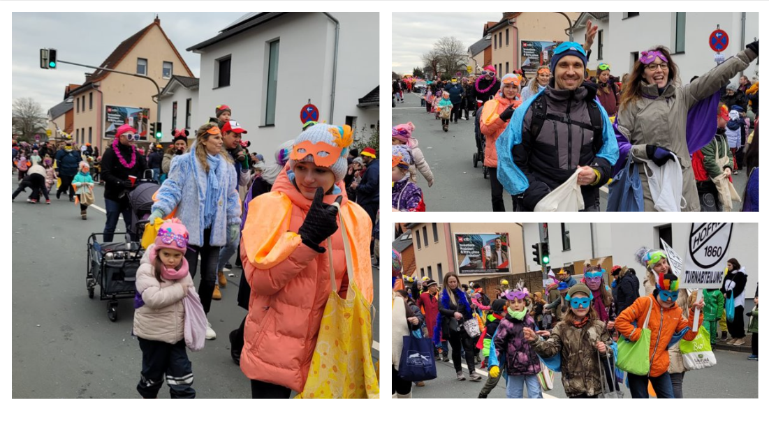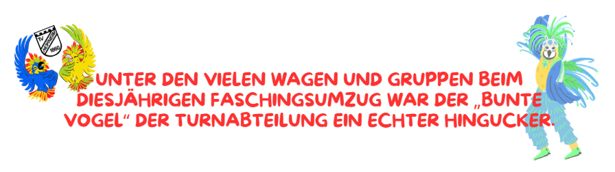 Unter dem Motto „bunte Vögel“ war die Turnabteilung dieses Jahr zum Faschingsumzug gekommen. Mehr als 50 Kinder, die jüngeren unter ihnen teilweise von den Eltern begleitet, liefen begeistert und von den am Straßenrand winkenden Zuschauern bejubelt durch die Hofheimer Innenstadt.