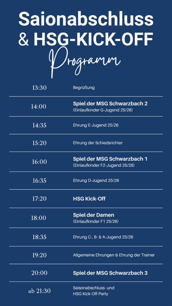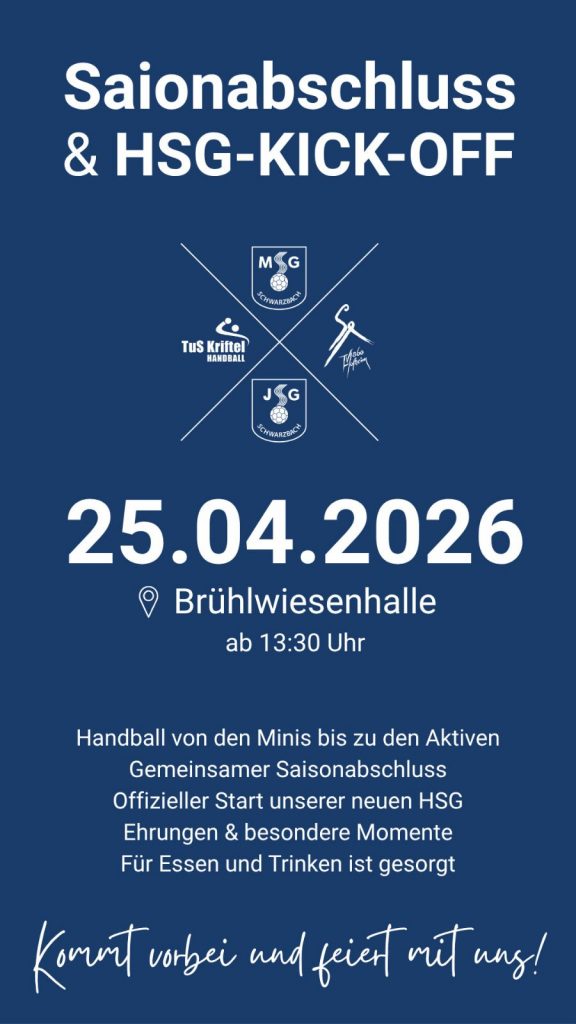 Die Handballabteilung möchte gemeinsam mit euch den Saisonabschluss feiern und zugleich den Start in die neue HSG mit der TuS Kriftel einläuten. Freut euch auf einen besonderen Tag voller guter Stimmung und Vorfreude. Lasst uns gemeinsam auf die vergangene Saison zurückblicken und voller Energie in die neue Zukunft starten.